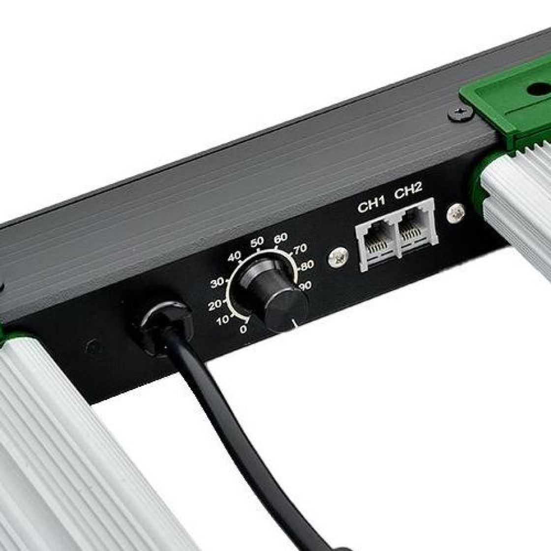 Valaisimen virtalähde on integroitu päätypalkkiin, josta löytyvät myös RJ14-portit ulkoista ohjainta ja valaisinten linkittämistä varten sekä manuaalinen himmennin 10-100%.