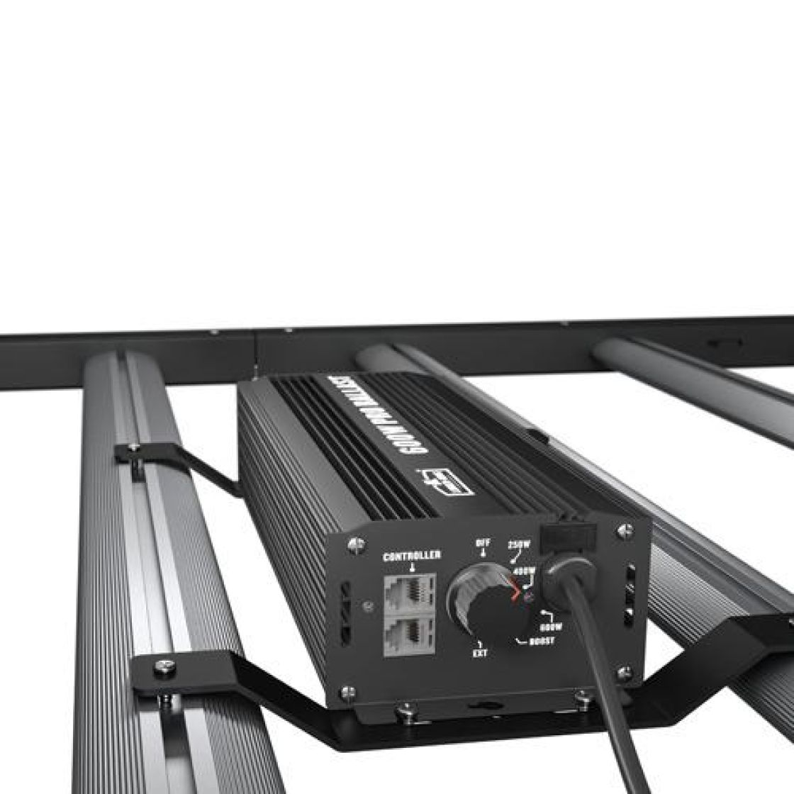 Valaisimen virtalähde on integroitu päätypalkkiin, josta löytyvät myös RJ14-portit ulkoista ohjainta ja valaisinten linkittämistä varten sekä manuaalinen himmennin 10-100%.