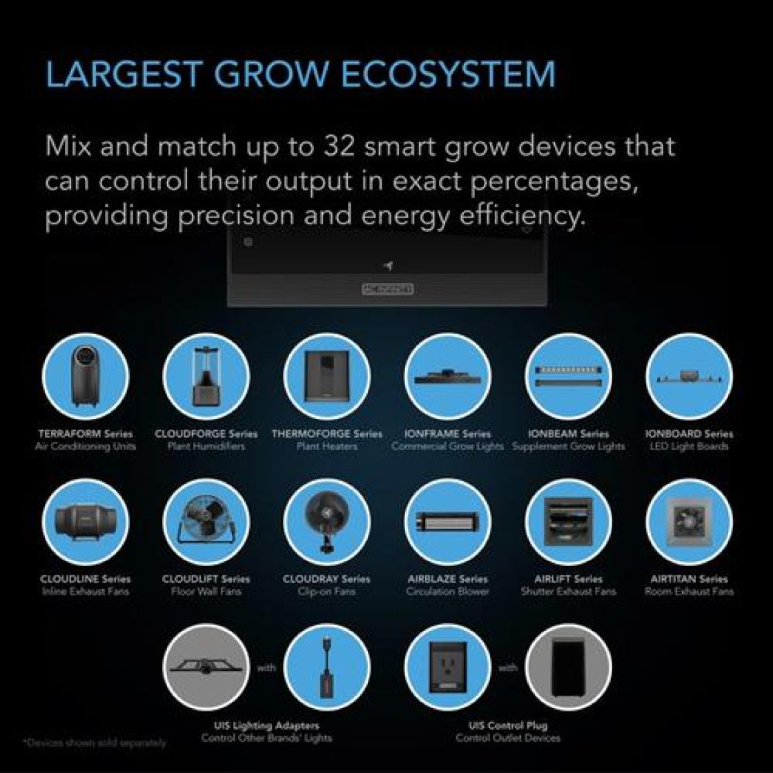 CONTROLLER AI+ älykäs, kosketusnäyllä varustettu kasvihuonekontrolleri, joka käyttää tekoälyäavustettua oppimista laitteiden universaaliin ohjaamiseen ja optimaalisten ilmasto-olosuhteiden valvontaan. Voit yhdistää jopa 32 UIS™, tai kolmannen osapuolen -laitteeseen (splittereitä/adaptereita käytettäessä), kuten tuulettimiin, kasvivaloihin, ilmankostuttimiin/kuivaimiin, lämmittimiin/viilentimiin, co2-annostelijoihin jne. optimoidaksesi kasvatustilastasi mm. lämpötilan, kosteuden, sekä VPD- ja valaistus-tason. AI+ kontrolleri sisältää myös älykkään ulkotilan valvonnan, joka seuraa ilmastoa sekä telttasi sisällä, että ulkopuolella suurien vaihteluiden välttämiseksi. AI+ kontrolleriin voidaan lisätä myös erikseen hankittavat CO2-, hydro- ja multa-anturit (tulevaisuudessa myös pH ja EC) , joilla automatisoitavien ja hyödynnettävää dataa tuottavien laitteiden lista vain jatkuu.