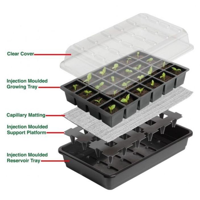 Viisiosainen kasvihuone jossa on ruiskuvalettu alusta, kannatteleva taso, 12 kennoinen ruukkusarja, kastelumatto ja läpinäkyvä kansi. Jokainen kenno on 5x4,7x5,8cm, tilavuudeltaan 0,1 litraa. Käytössä kestävä ja helposti pestävä. Alusastia ja taso voidaan pestä tiskikoneessa. Ideaalinen ikkunalaudalle. Tehty kierrätetystä muovista.