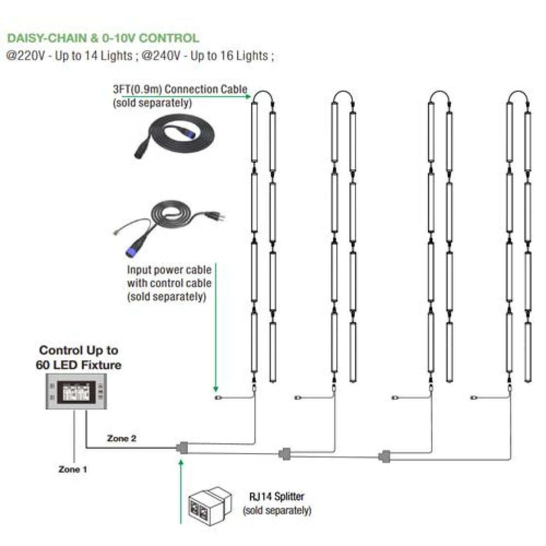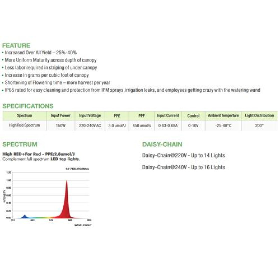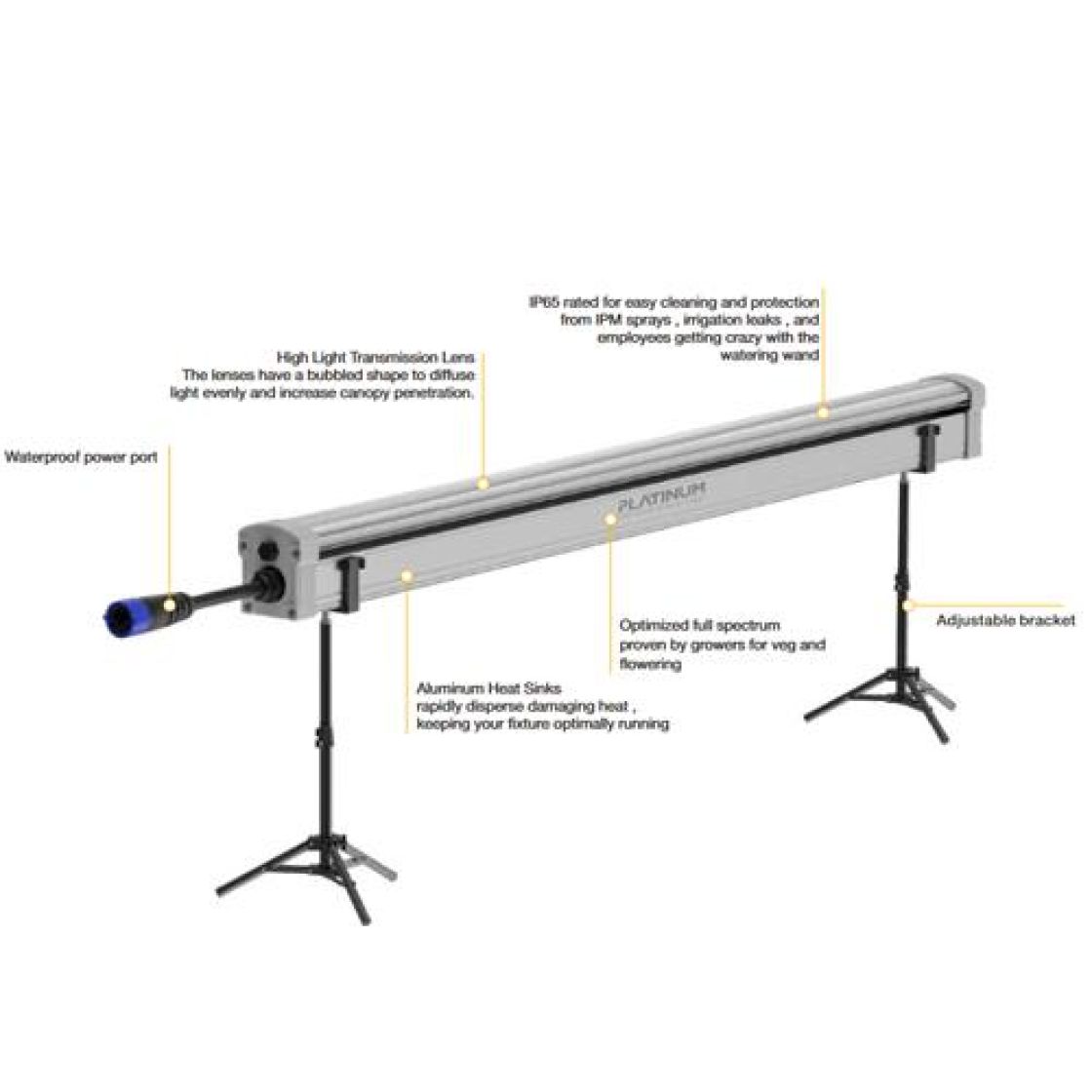 Tehokas, mutta viileä 150W-valaisin, jonka spektri koostuu pääsääntöisesti punaisista aallonpituuksista. Platinum Under Canopy-valaisimen lisääminen puutarhaasi auttaa sadon kehitystä myös kasvuston alemmissa osissa, joihin päävalaisimen valontuotto ei enää kunnolla yllä. Näin koko kasvusto kehittyy samaan tahtiin, eikä turhaa massaa pääse syntymään. Platinum Under Canopy-valaisimissa on sisäänrakennettu virtalähde ja niitä voidaan linkittää toisiinsa (max. 16kpl) erikseen hankittavalla linkkikaapelilla, jolloin ne toimivat yhdellä virtajohdolla. Valaisimen mukana toimitetaan myös kätevät jalustat, joiden avulla valaisin saadaan optimoitua etäisyys kasvustosta. Valaisinta voidaan myös himmentää ulkoisella 0-10V ohjaussignaalia lähettävällä säätimellä.